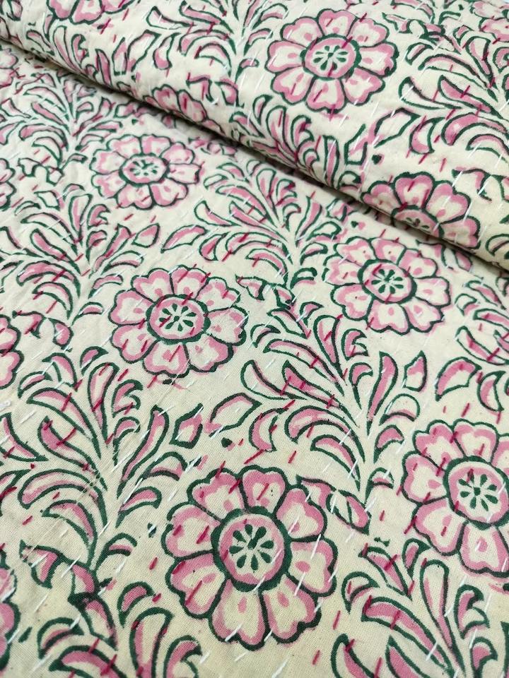 Luxurious Handmade Indian Cotton Kantha Quilt Soft Pink Green Hand Block Print Bedspread Queen Bedcover Throw Blanket Soft Home