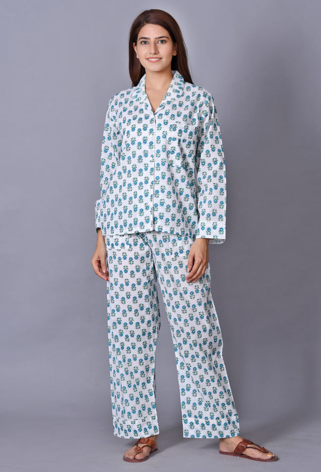 Indian Cotton Pajama Set for Women 100% Ultra-Soft Light Block Print Night Dress Plus Size Cotton Pants Shirt Set