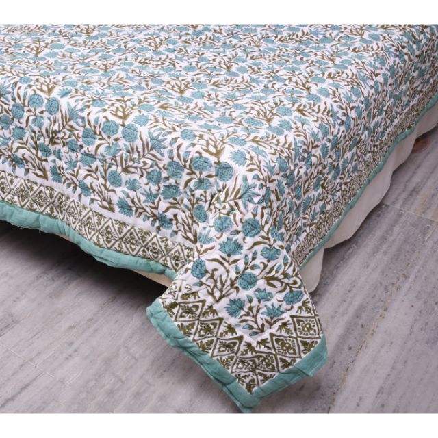 Indian Cotton Rajai Quilt Cotton Block Floral Reversible White & Sky Blue Indian Bedding Throw Quilt Hand Printed Jaipuri Rajai