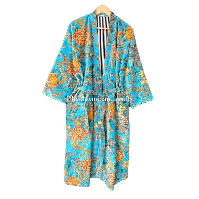 Indian Cotton Velvet Unisex Kimono Hand Stitched Floral Printed Bathrobe/Gown Boho Hippie Style Plus Size Woven Unisex Kimono