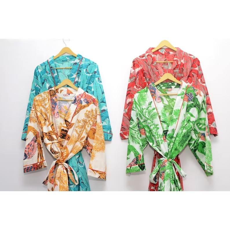 Indian Cotton Women's XL Blue Hand Block Print Poncho Bathrobe 4 Piece Maxi Gown Night Suit Wrap Dress Plus Size Summer Bath Spa