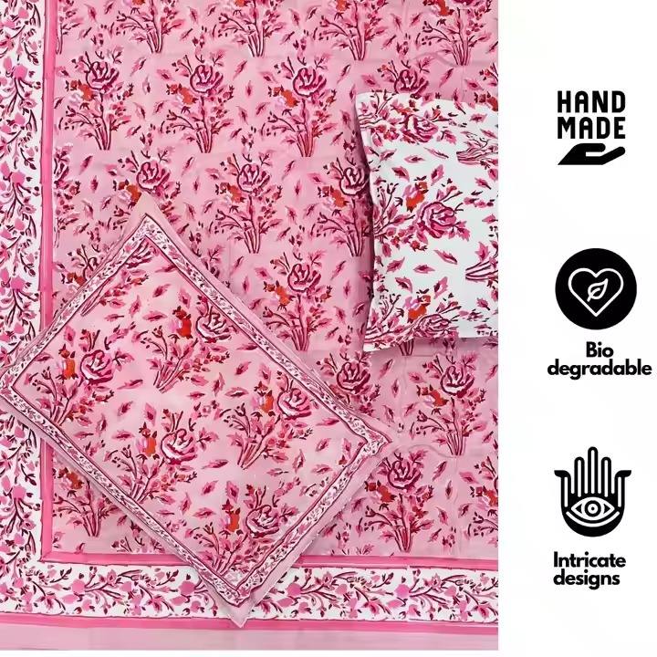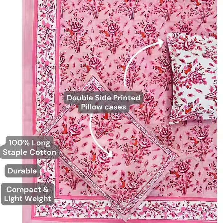 Indian Craftsmanship King Size Bedding Set Hand Block Print Pink Rose Floral Vintage Style 90"x108" Pillow Case Cotton Sets