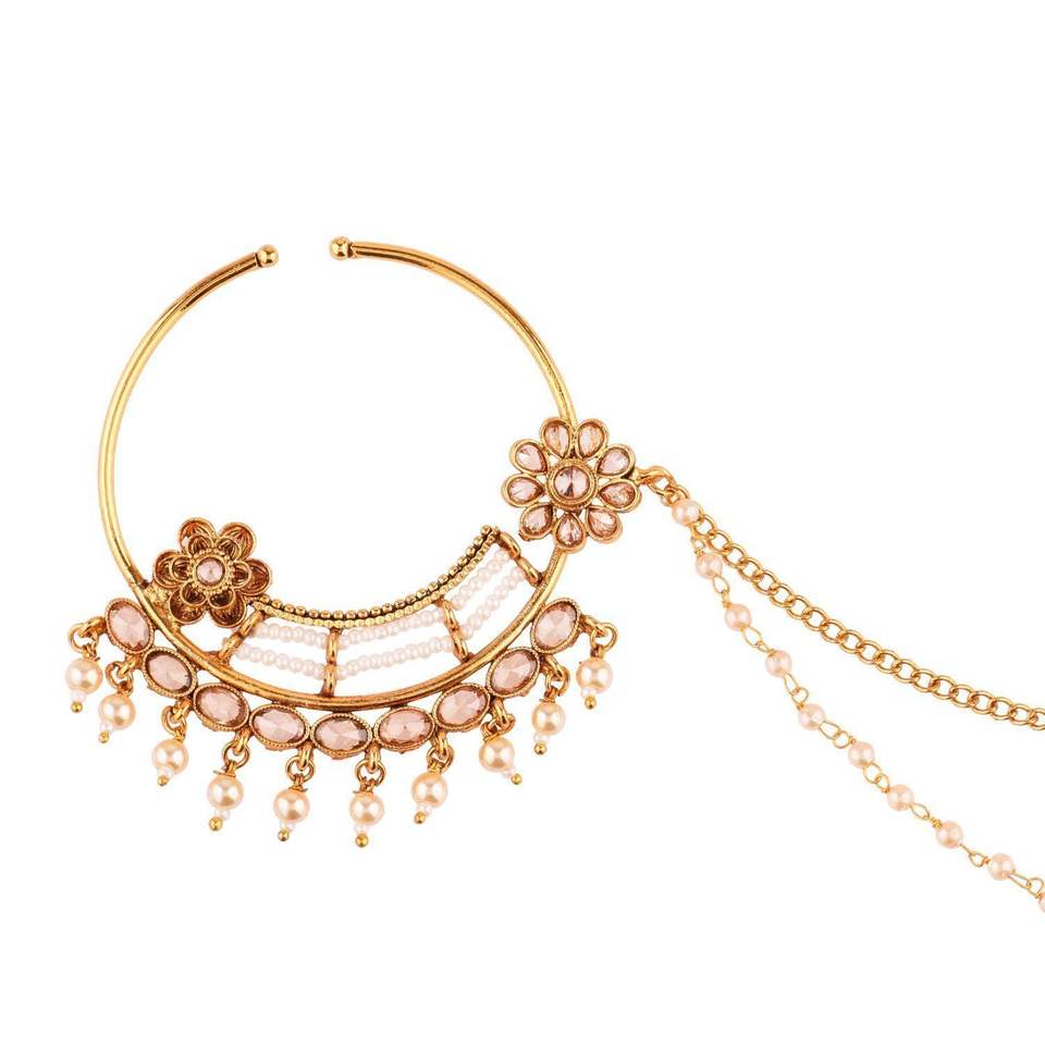Indian Crystal Jewelry Traditional Gold Plated Floral Kundan Septum Nose Ring With Chain Bridal Jewellery Supplier