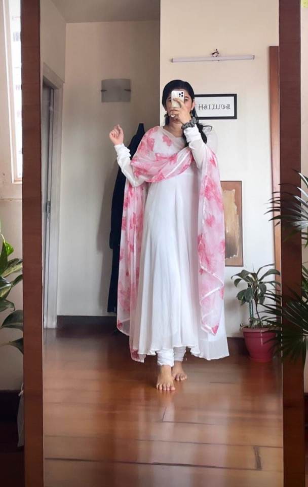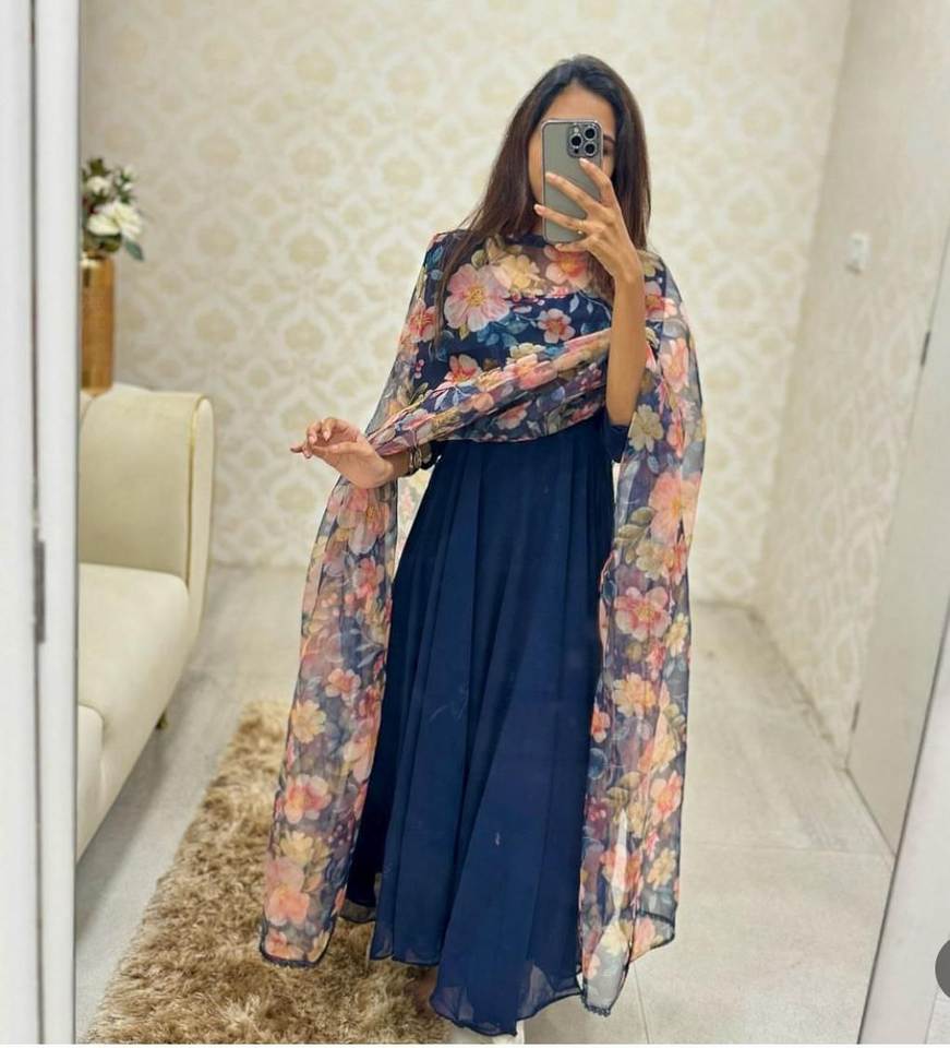 Indian Designer Blue and Red Georgette Fabric Kurti with Long Length Golden Embroidered Chudidaaar and Stole for Weddings