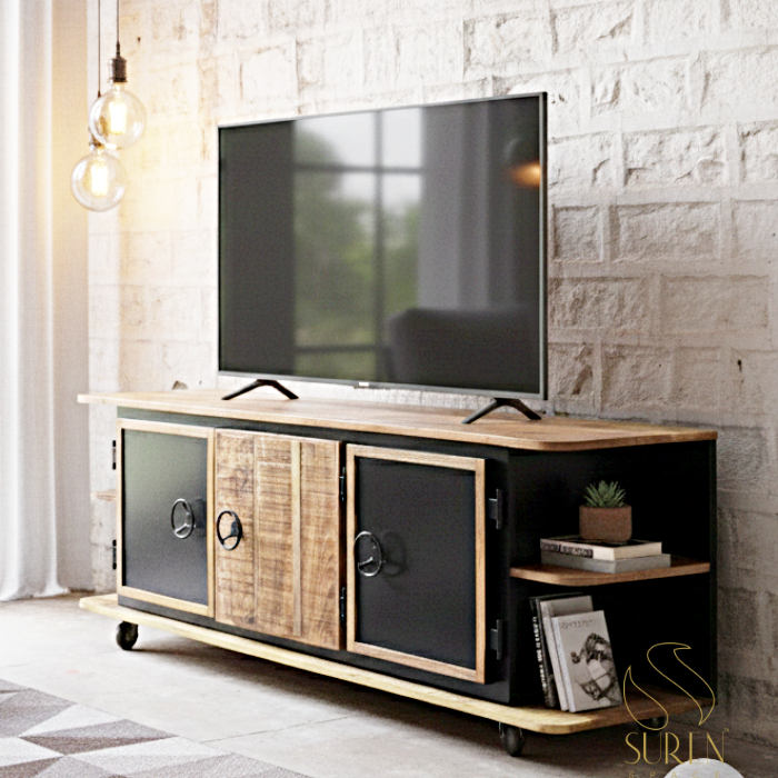 Indian Designer Luxury Antique Mango Wood Iron TV Cabinet Handmade Solid Wood Stand Industrial for Home Hotels Living Room Hall