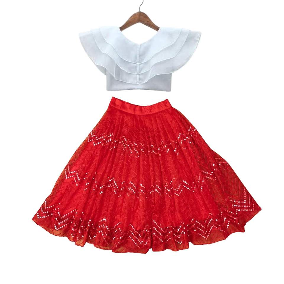 Indian Designer Red Net Lehenga Choli Shoryam Fashion Girls Party Wear Floor-Length Zigzag Sequin Work Skirt White Ruffle Top