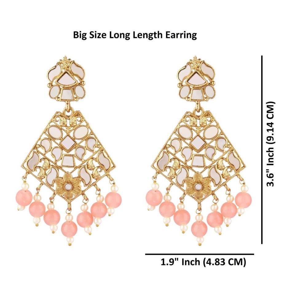 Indian Earring Set Gold Plated Crystal Glass Stone Faux Pearl Dangle Drop Earrings Jewellery, Peach Color