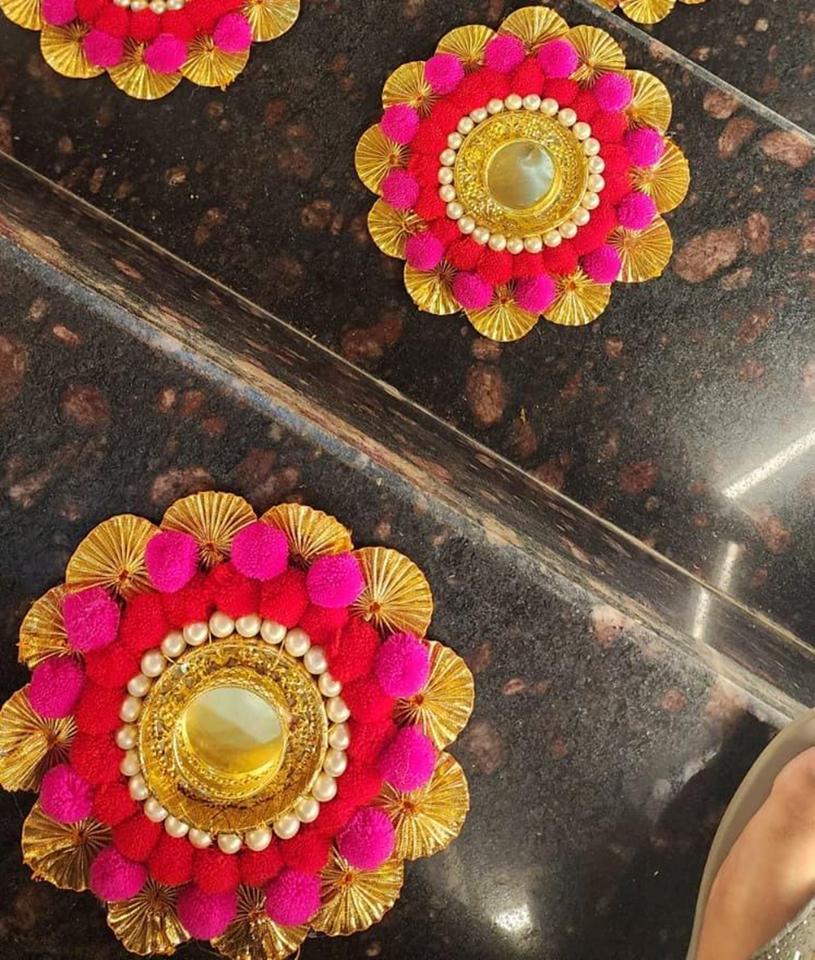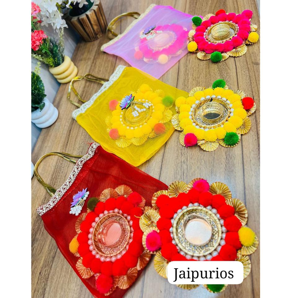 Indian Elegant Designer Pom Pom Candle Holder Platter with Gift Bag Festive Diwali House Warming Gift Set for Holiday Supplies