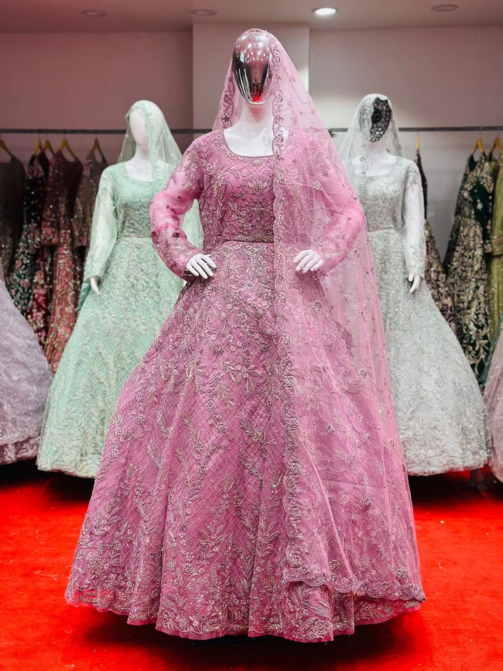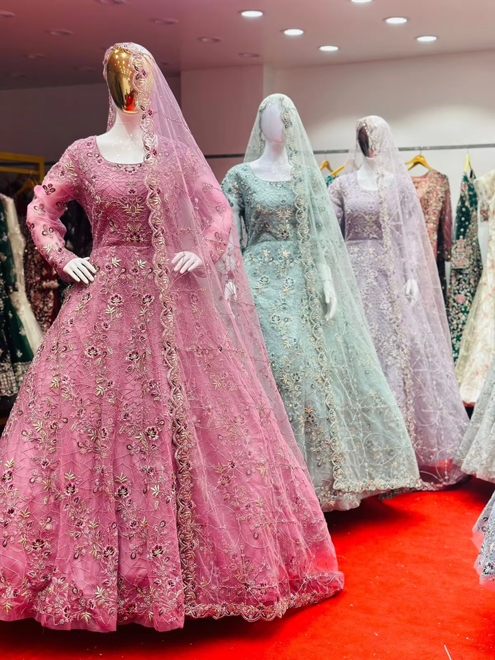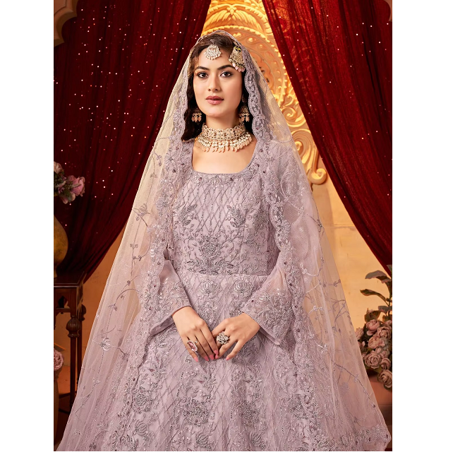 Indian Ethnic Long Anarkali Gown for Women's Party Wear Adults Fancy Embroidery Net Dupatta Made of Net Material