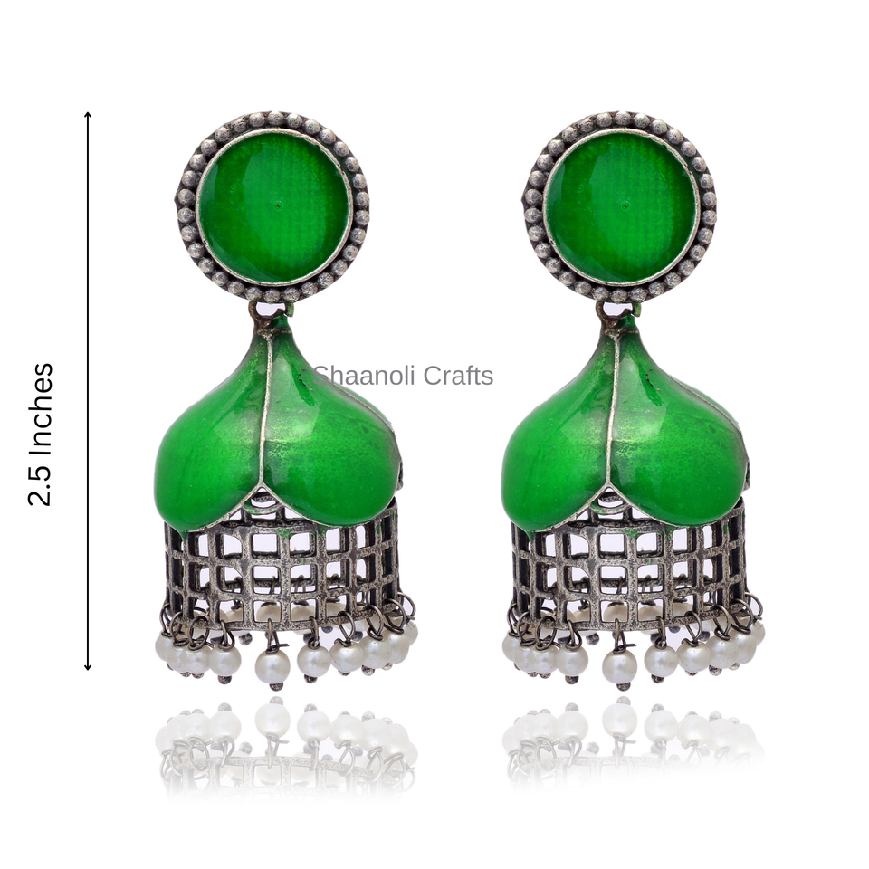 Indian Handmade Designer Jhumkas Green Plated Silver Oxidized Jhumkas Earrings Fashion Jewellery for Wedding , Haldi , Favors