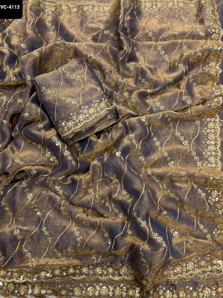 Indian Ethnic Wear Fandy Chiffon Silk Material Sari with Golden Zari with Sequence Work and Embroidery Work Blouse for Wedding