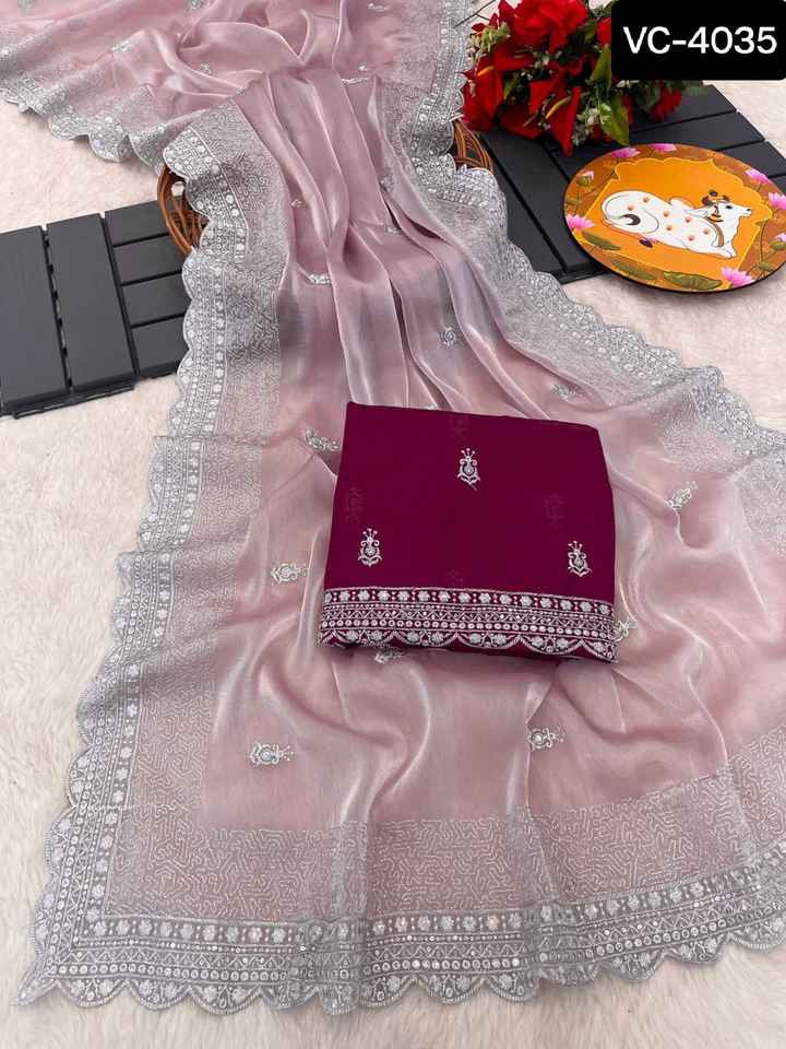 Indian Ethnic Wear Jimmi Cho Fabric With Dual Colour Sequence and Thread Embroidery Work Saree and Satin Banglory Silk Blouse