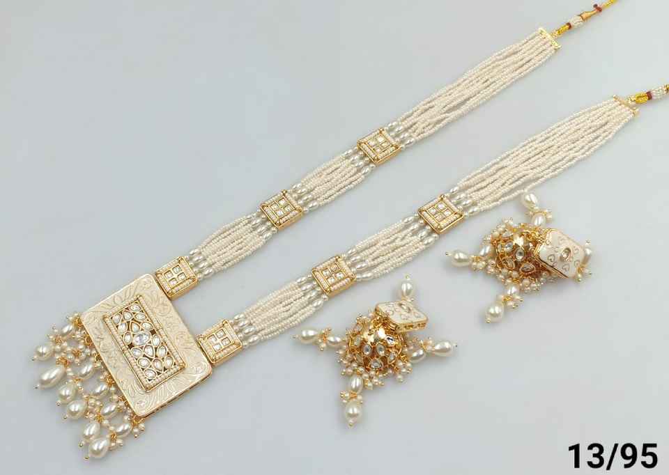 Indian Fancy Traditional Motipearl Drop & Kundan Long Mala Pendent Necklace Set GoldTone Kundan Pearl Long Necklace Earring Set