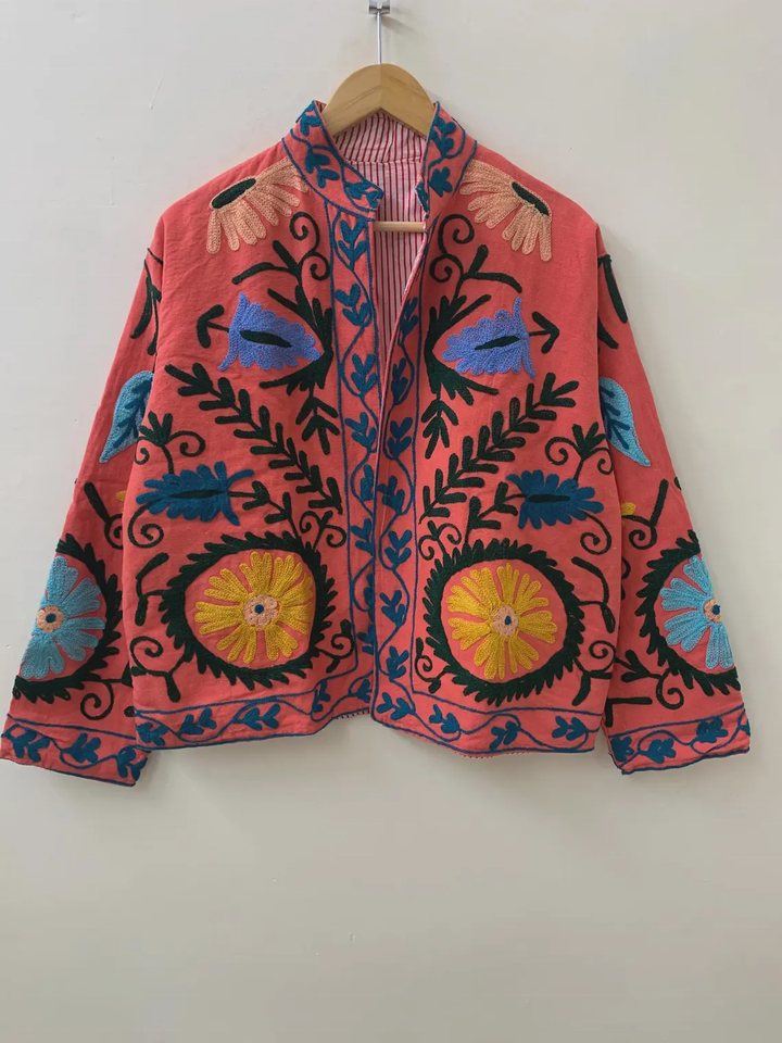 Indian Floral Embroidered Suzani Jacket 100% Cotton Winter Coat with Knitted Processing Short Coat Style