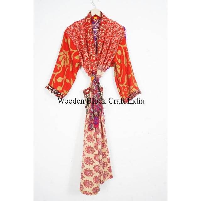 Indian Floral Print Long Silk Kimono Dressing Gown Nightwear Robe Vintage Silk Kimono Beach Wear Cover up Gift for Women