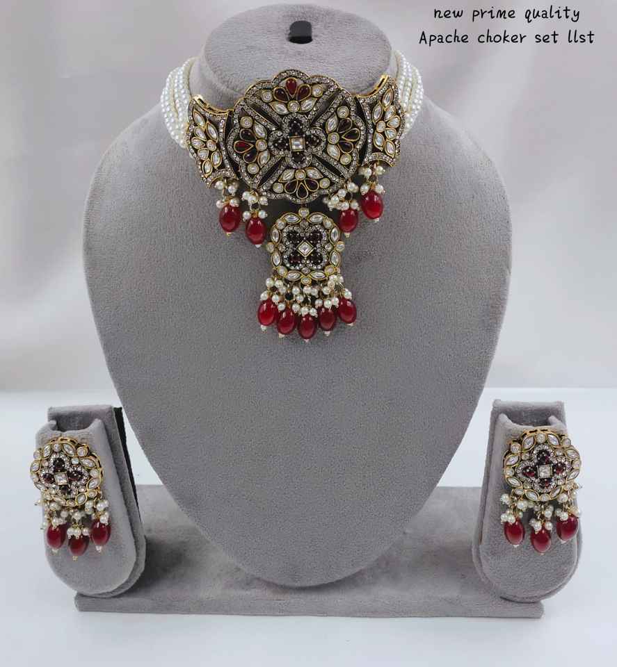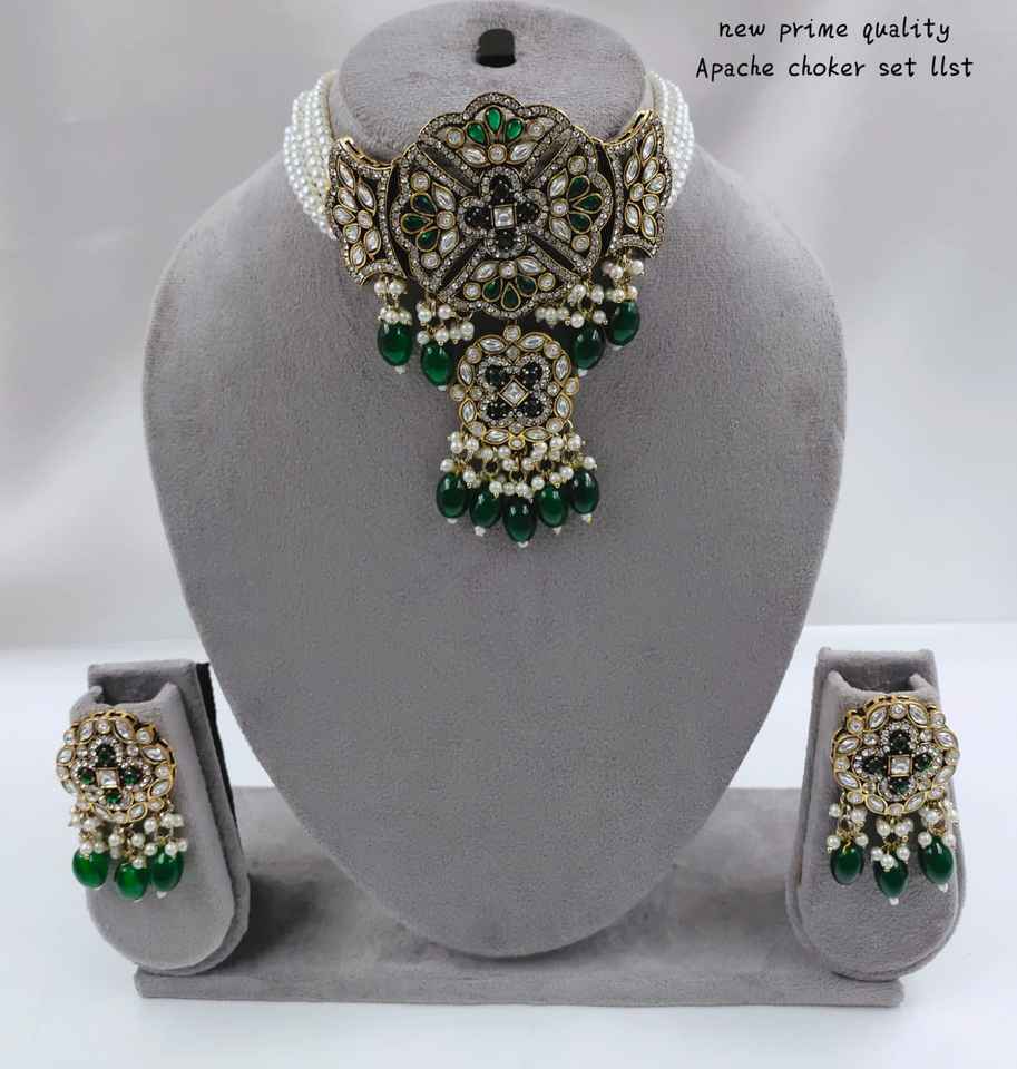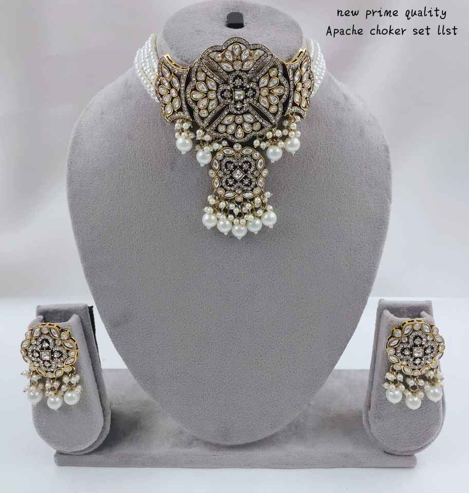 Indian Flower Stylish Fancy Choker Motipearl Pendent Mala Drop & Kundan Traditional Gold Tone Pearl Choker Necklace Earring Set