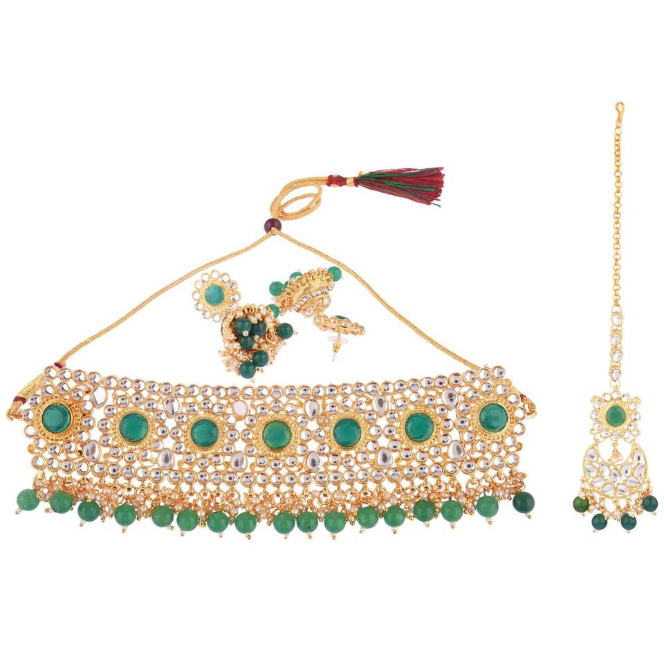Indian Gold Plated Crystal Kundan Faux Pearl Bridal Choker Necklace Jewellery Set for Women Copper Material for Wedding Party