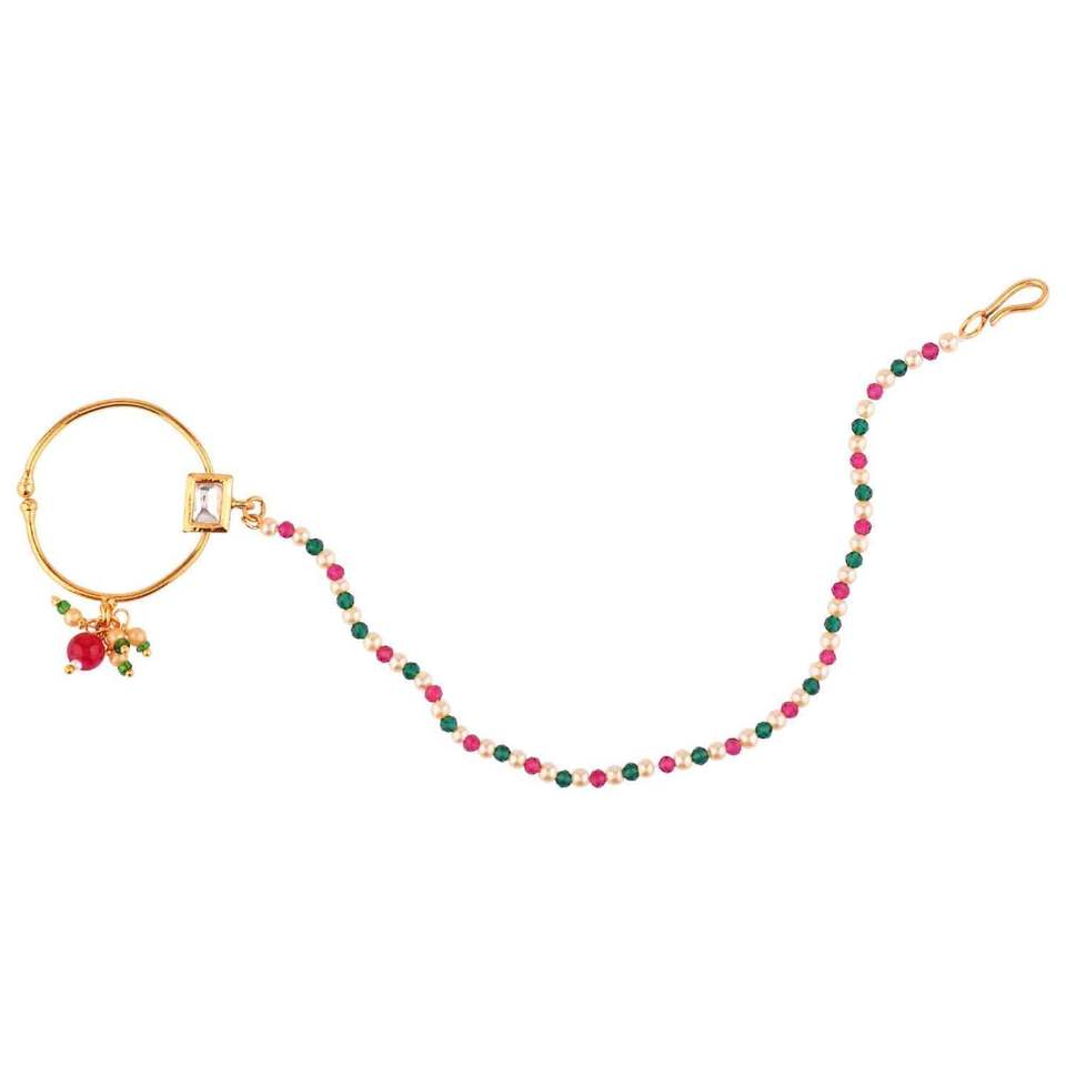 Indian Gold Plated Jewelry Traditional Crystal Kundan Nose Ring With Faux Pearl Beaded Chain Wholesale Jewellery