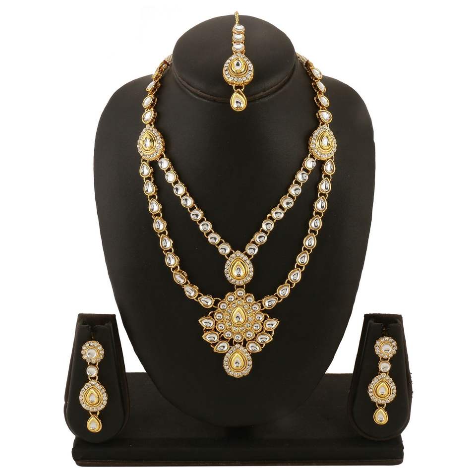 Indian Gold Plated Kundan Wedding Necklace Earring Set with Mangtikka Crystal Fashion Drop Earrings Wholesale Jewelry for Women