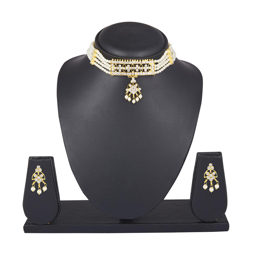 Indian Gold Plated Traditional Jewellery Manufacturers Crystal Faux Pearl Beaded Bridal Choker Necklace Jewelry Set, White