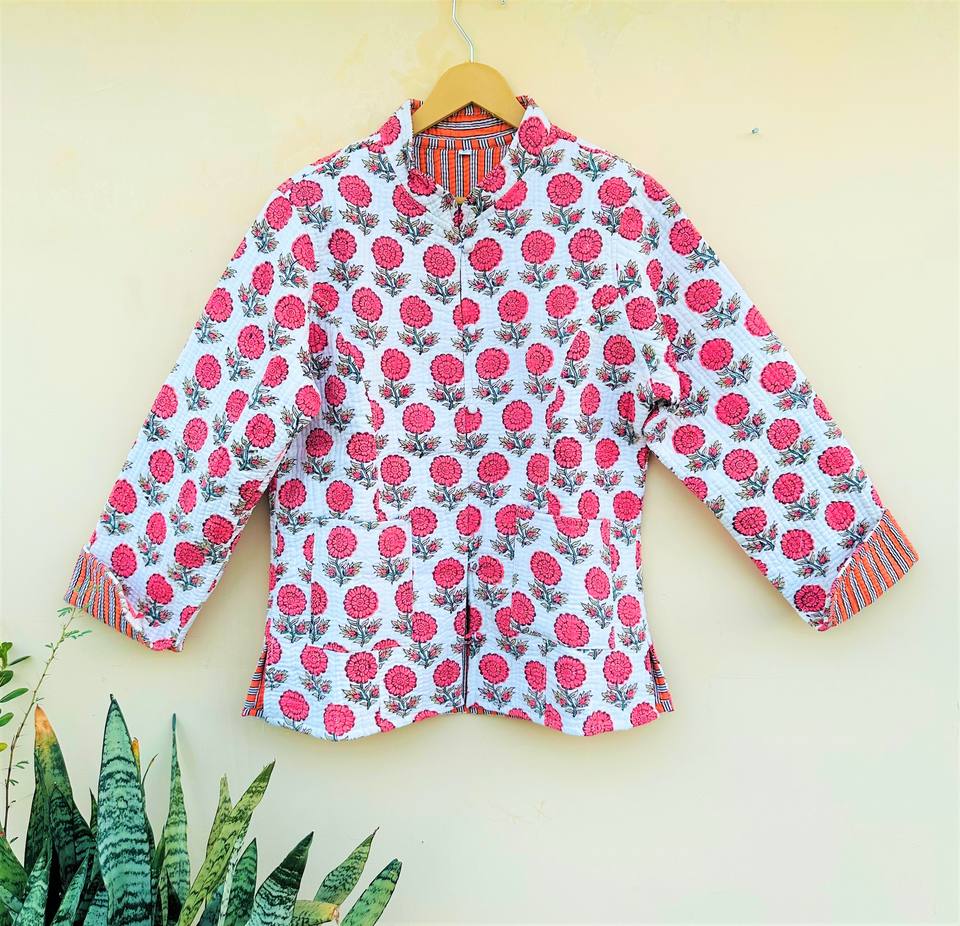 Indian Hand Block Print Corduroy Jacket for Women Quilted with Cotton Filling New Style Sky Blue Flower Coat for Autumn