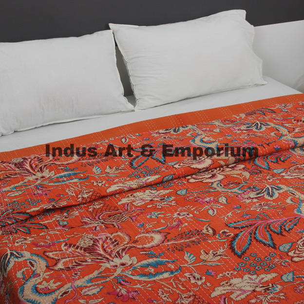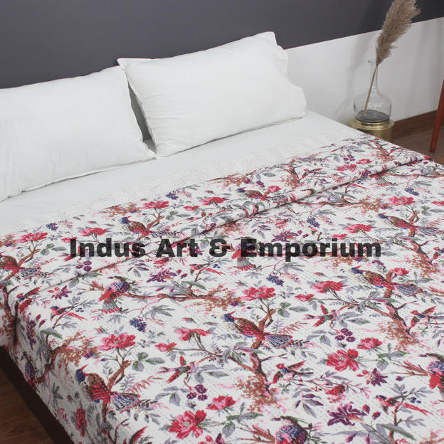 Indian Hand Block Printed Cotton Patchwork Vintage Cotton Kantha Bedcover Floral Kantha Bedcover
