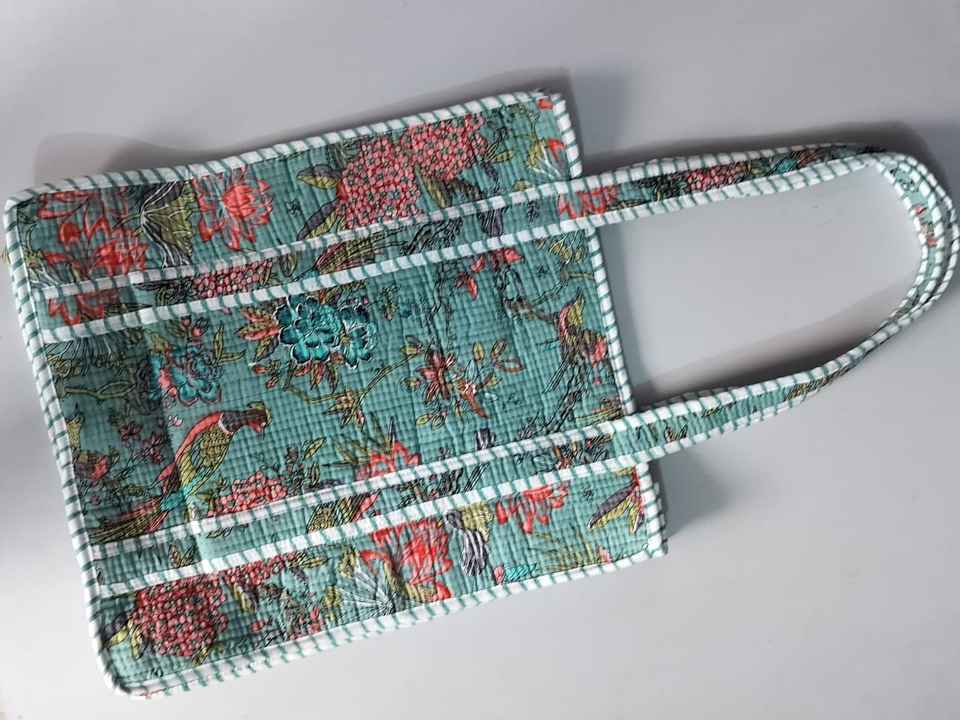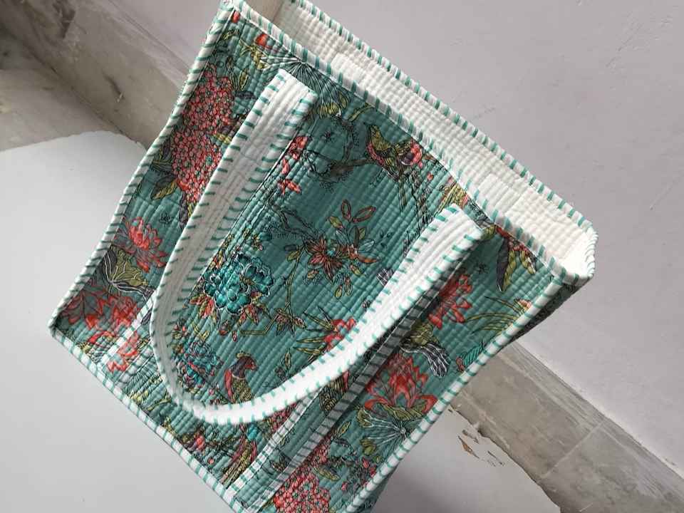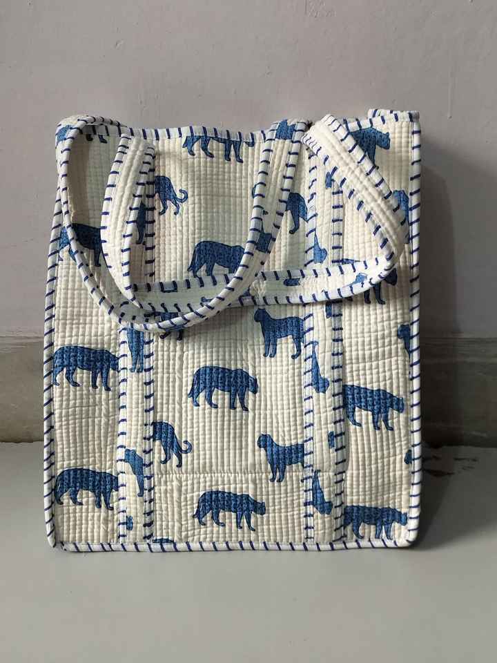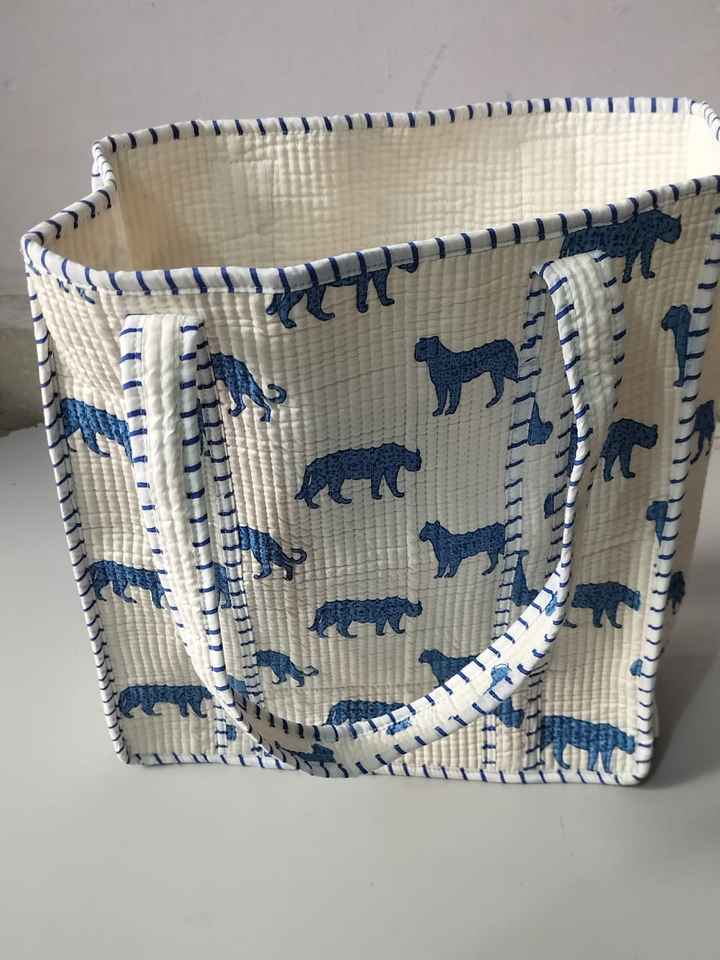 Indian Hand-Block Printed Quilted Cotton Lined Tote Shopping Bag Embroidered Jugle Design Women's Shoulder Handbag Summer