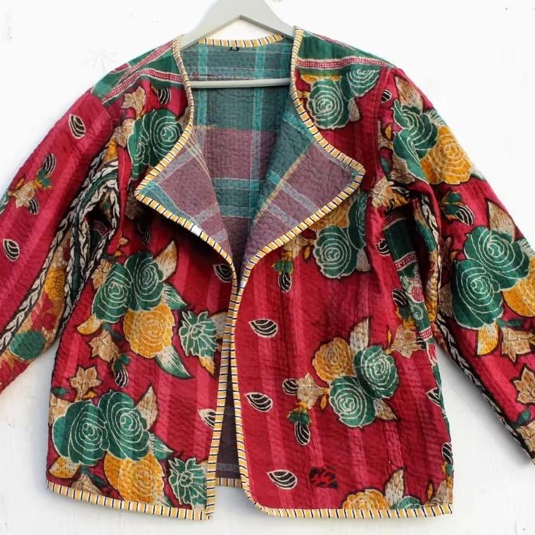 Indian Handmade Women's Reversible Kantha Quilted Jacket Real Patchwork Woven Cotton Long Breathable Length