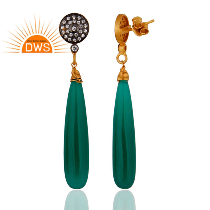 Indian Handcrafted Jewelry Graceful Look White Zirconia Green Onyx Gemstone 925 Silver 18K Gold Plated Earrings