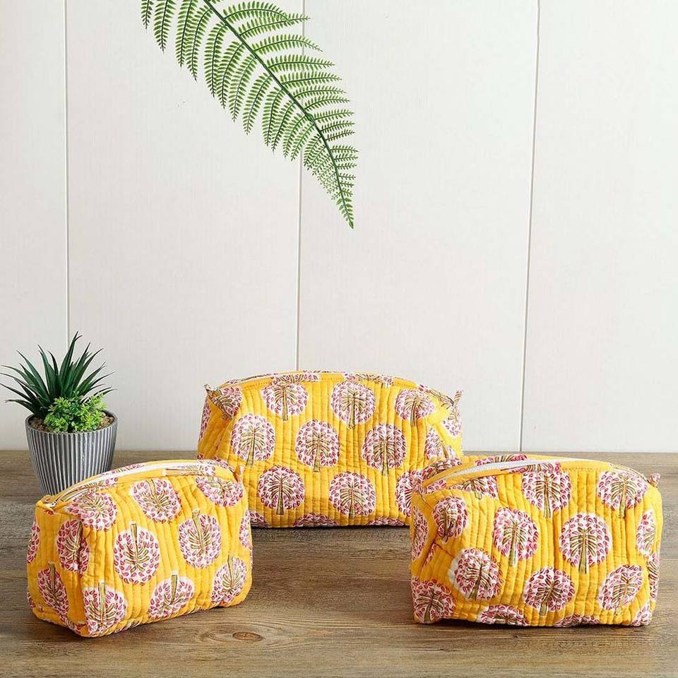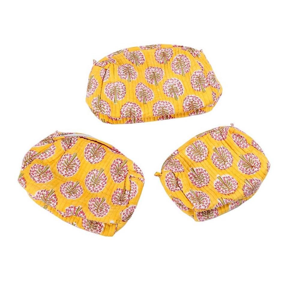 Indian Handmade 3 Pieces Set Quilted Cosmetic Kit Toiletry Pouch Best Quality Floral Block Printed Wholesale Cotton Makeup Bag