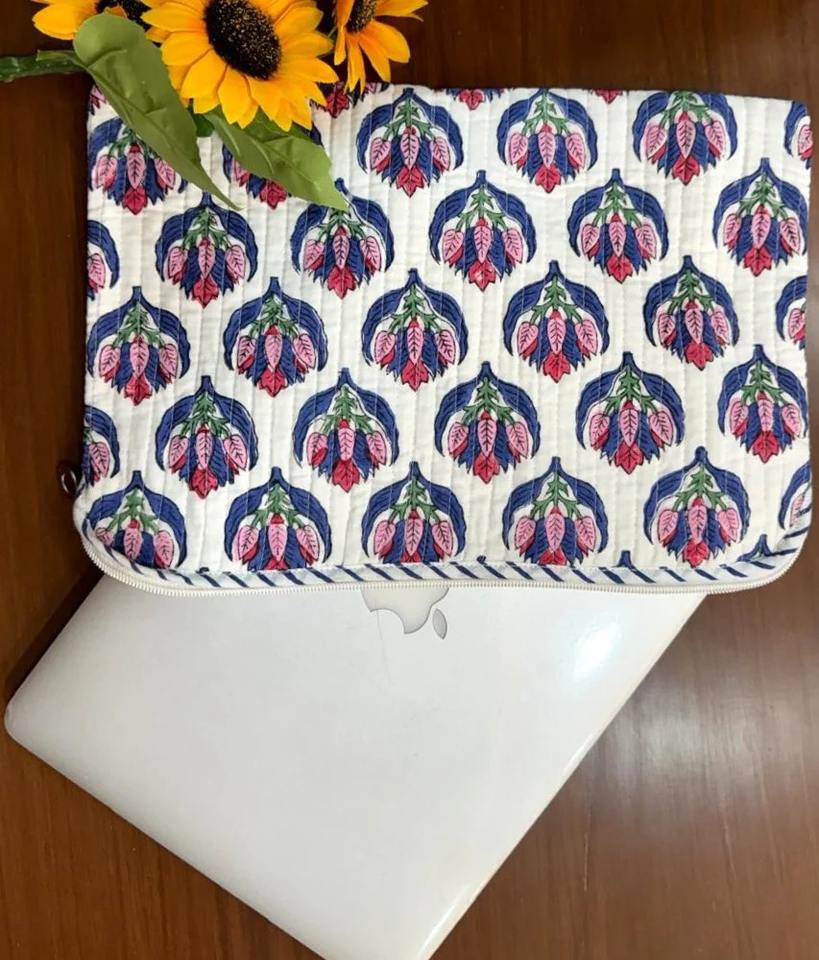 Indian Handmade Block Print Laptop Sleeve Case Pure Cotton Floral Printed Quilted Vintage Style Laptop Cover with Zipper Closure