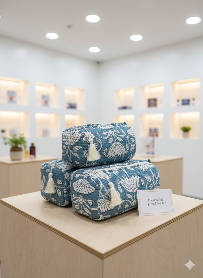 Indian Handmade Gray Vintage Floral Print Eco-Friendly Water Resistant Cotton Case Beaded Tassels Zipper Closure for Travel