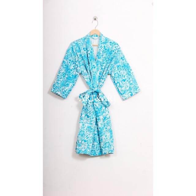 Indian Handmade Kantha Quilted Women's Summer Kimono Robe Hand-Stitched 100% Cotton Floral Design Quick Dry Sleep Wear
