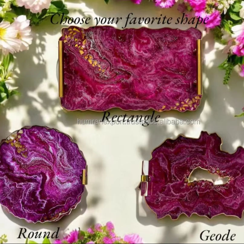 Indian Handmade White and Pink Crystal Epoxy Resin Tray with Gold Marbling and Handles for Serving & Cake Display