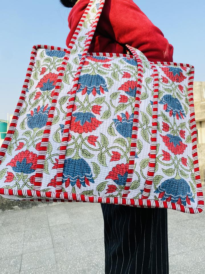 Indian Handmade Women's Vintage Boho Floral Printed Organic Cotton Tote Bag Zipper Closure Customizable Colors Sizes for All