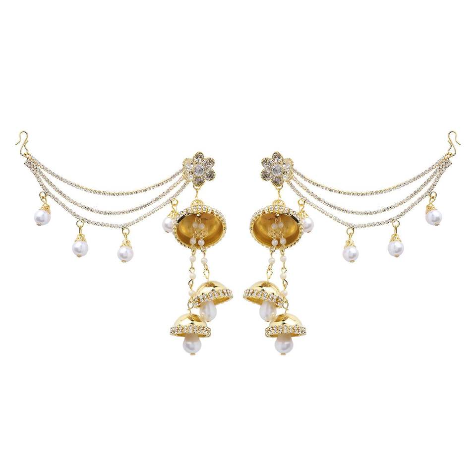 Indian Jewellery Manufacturers Crystal Rhinestone Layered Ear Chain Dangle Tassel Jhumka Earrings Set Wholesale Jewelry, White