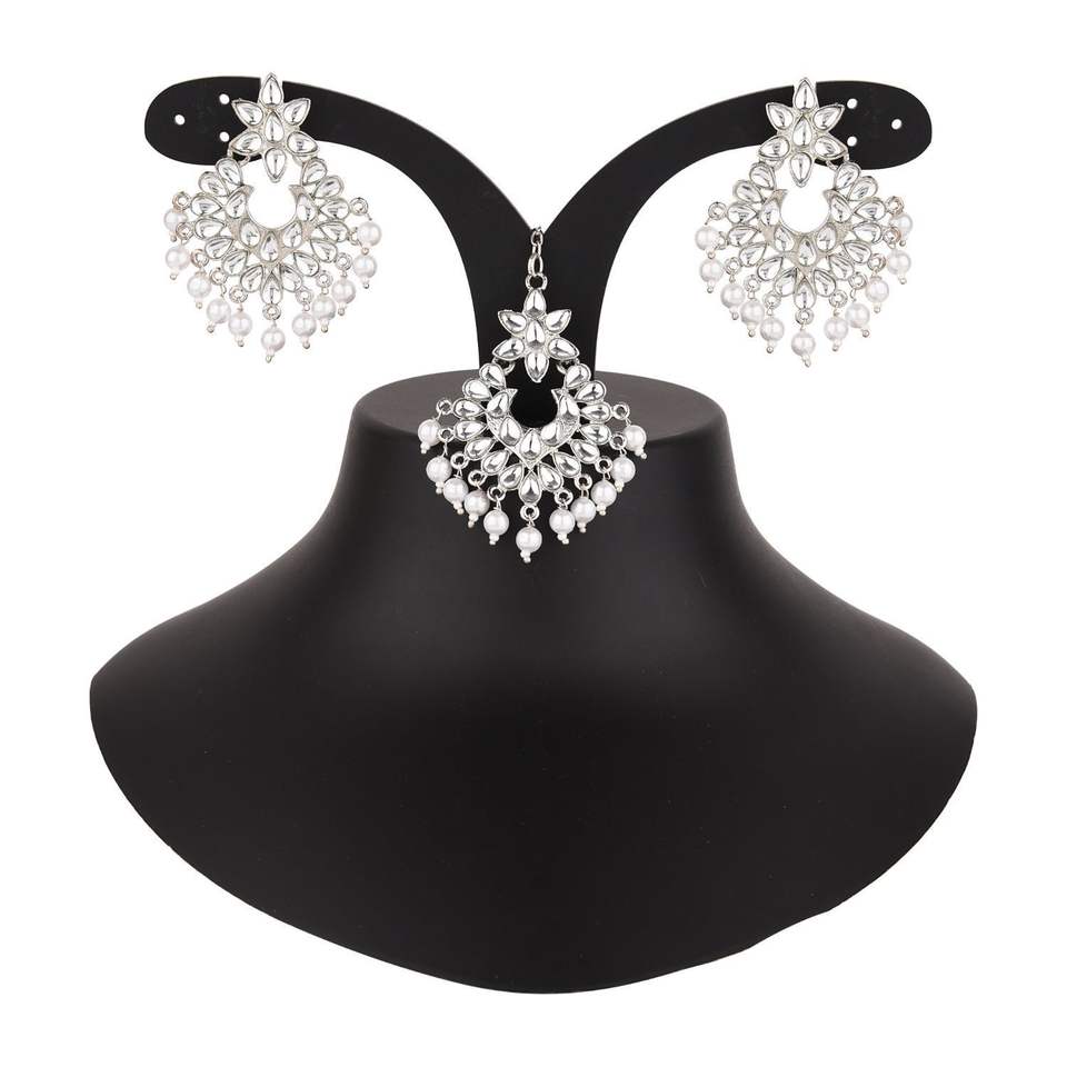 Indian Jewellery Manufacturers Kundan Faux Pearl Bridal Head Chain Maang Tikka Earrings Set For Women