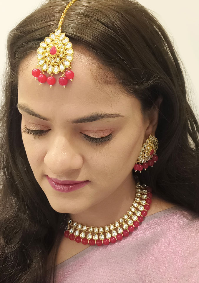 Indian Jewelry Choker Kundan Crystal Faux Pearl Necklace Earrings Maang Tikka Head Chain Bollywood Wedding Bridal Set