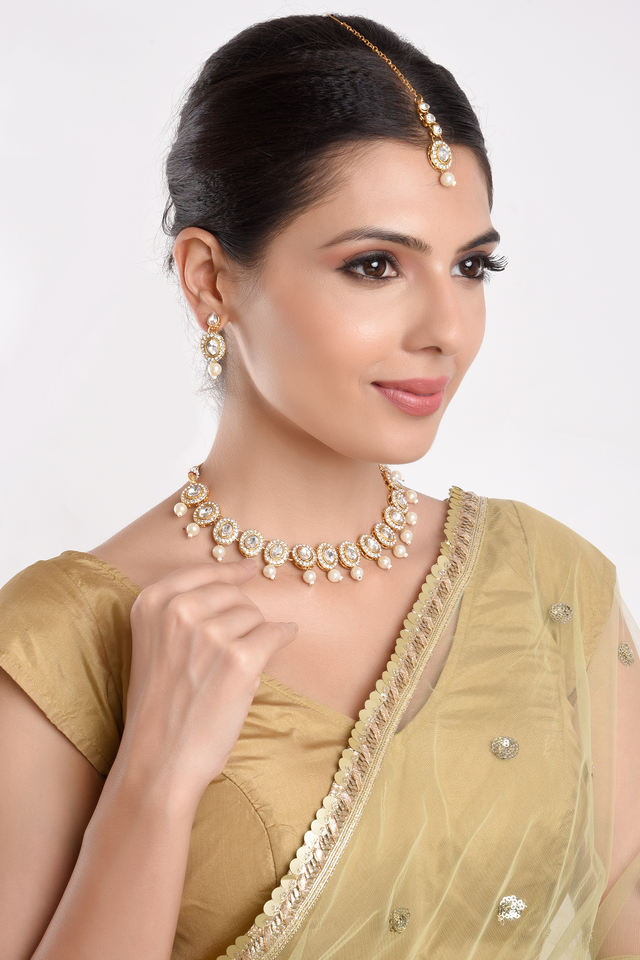 Indian Jewelry Choker Kundan Crystal Necklace Earrings Maang Tikka Head Chain Bollywood Wedding Bridal Set