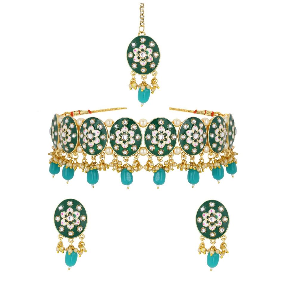 Indian Jewelry Choker Necklace Maang Tikka Earrings Bollywood Wedding Crystal Kundan Necklace Earrings Head Chain Set