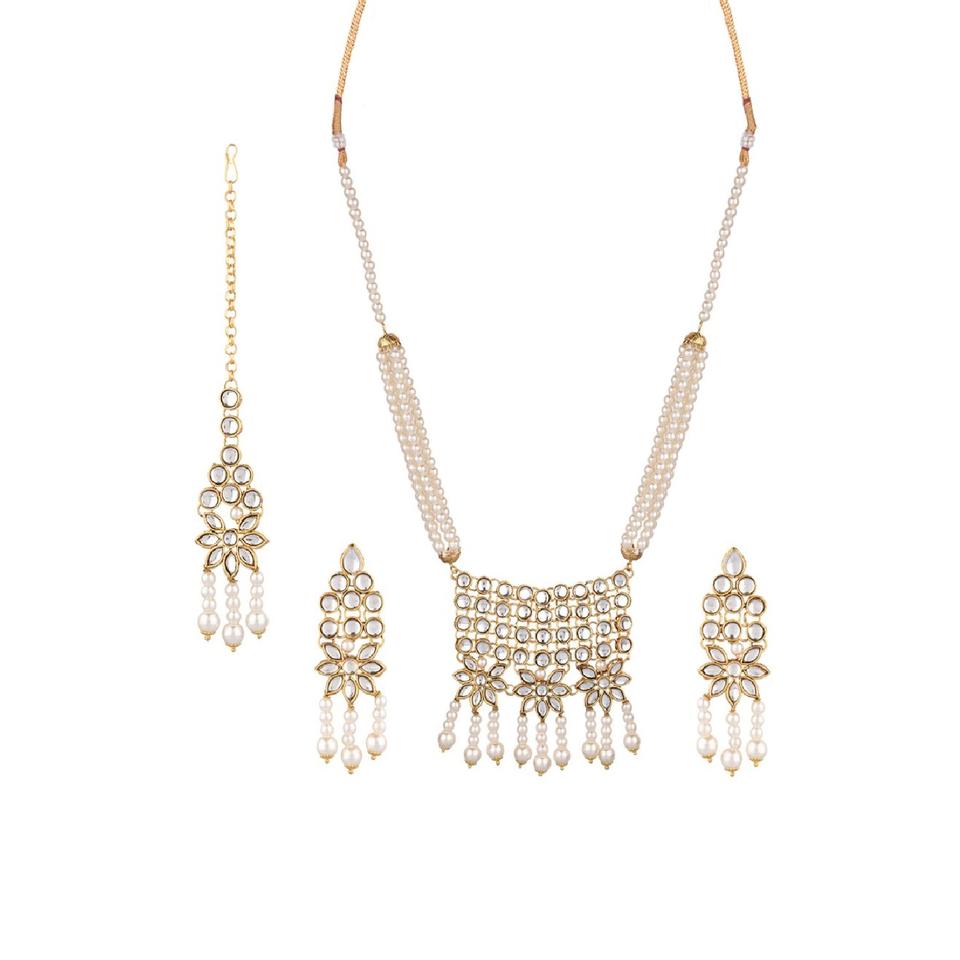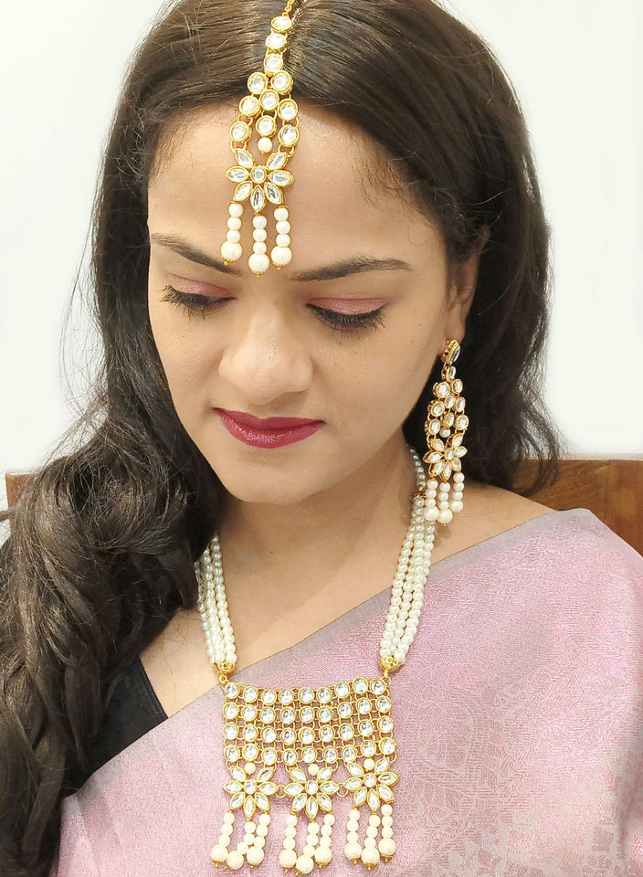 Indian Jewelry Kundan Crystal Faux Pearl Beaded Necklace Earrings Maang Tikka Head Chain Wedding Jewelry Set