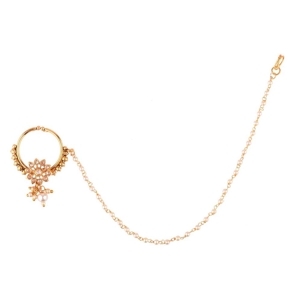 Indian Jewelry Nose Ring Crystal Kundan Bridal Nose Pin with Faux Pearl Chain Nath No Piercing Jewelry Accessories