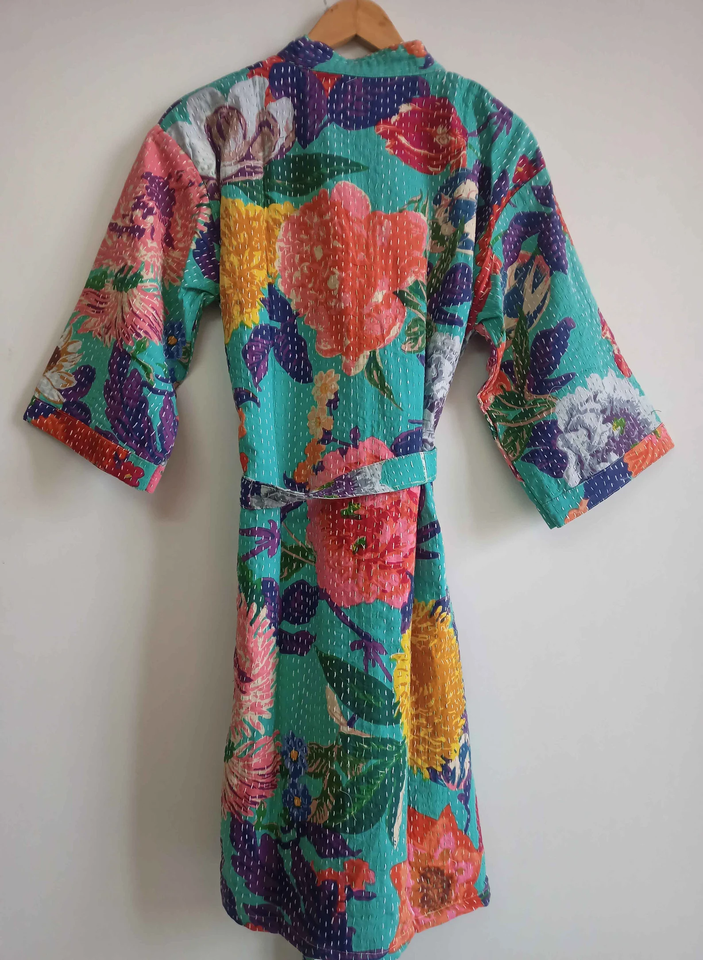Indian Kantha Unisex Long Winter Jacket Handmade Cotton Quilted Floral Pattern Belt Closure Breathable