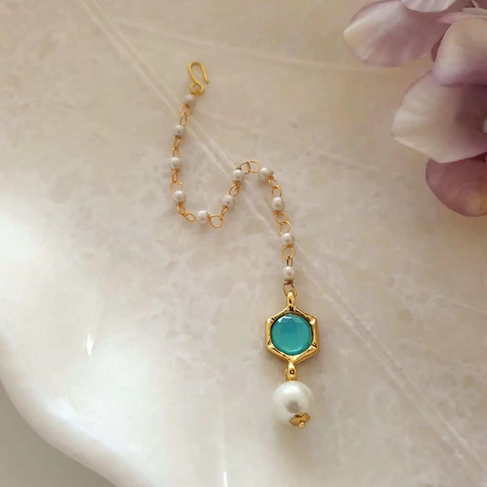 Indian Light Blue Stone Meenakari Design Pearl Beaded Maang Tikka Handmade Jewelry Manufactured in India For Women And girls