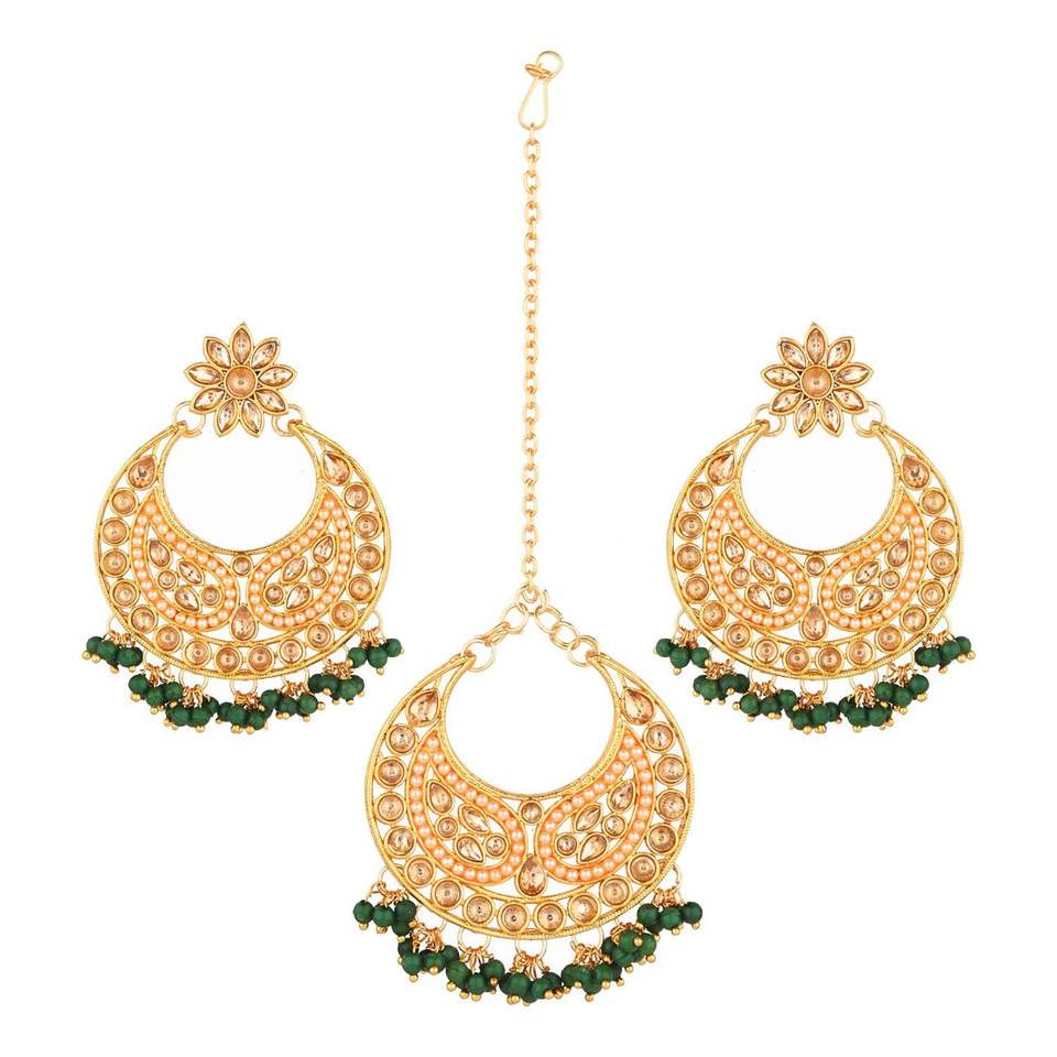 Indian Maang Tikka Earrings Set Crystal Faux Pearl Bridal Jewelry Set Indian Jewellery Manufactures Supplier, Green