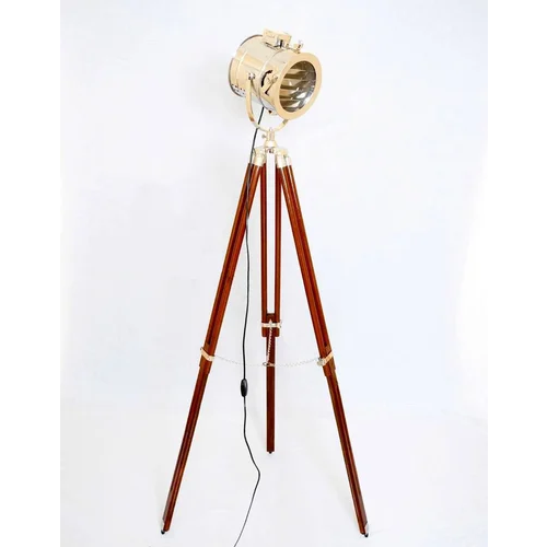 Indian Made Nautical Antique Brass Hollywood Spotlight Searchlight Wooden Tripod Floor Lighting Stand Marine and Decoration Use