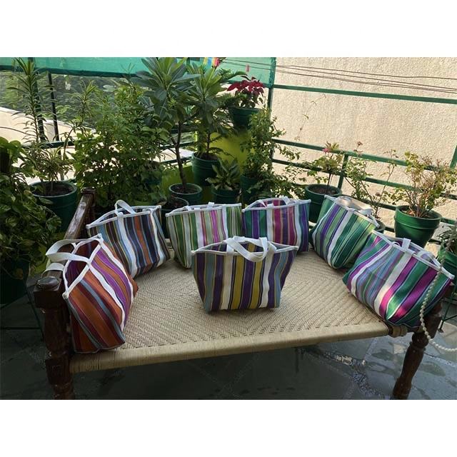 Indian Manufacturer's Recycled Nylon Striped Fabric Custom Logo Reusable Shopping Bags with Cotton Webbing Strap for Daily Use