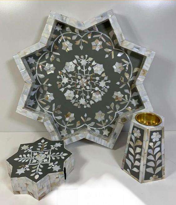 Indian Manufacturing Tray Incense Burner Set with Star Design Sandalwood Bergamot Ginger Scent Bakhoor Vase Mother Pearl Box