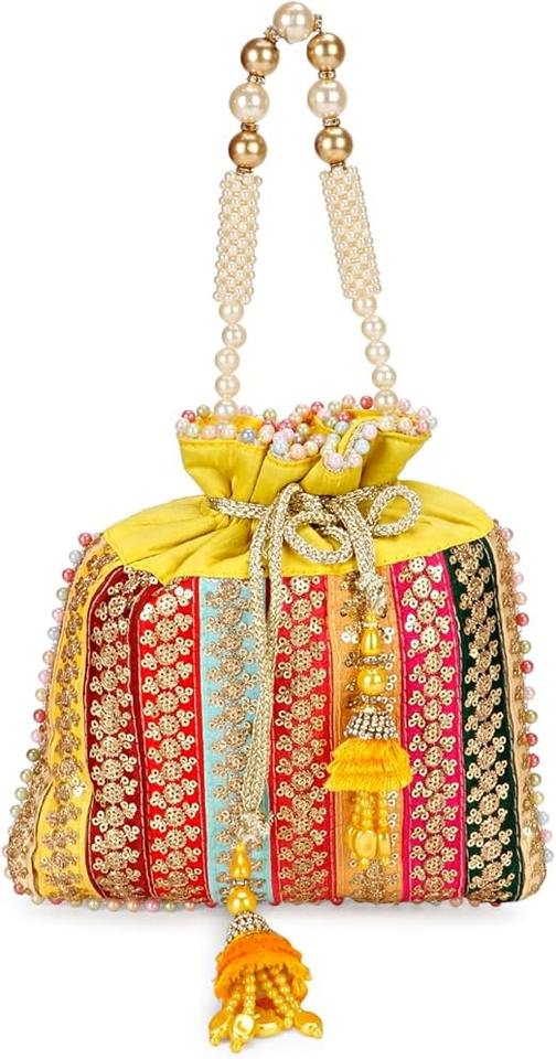 Indian Ethnic Fashion Women's Mini Potli Bag Multi Colored Fancy Lace Raw Silk Drawstring Closure Custom Logo Option Gift Ready