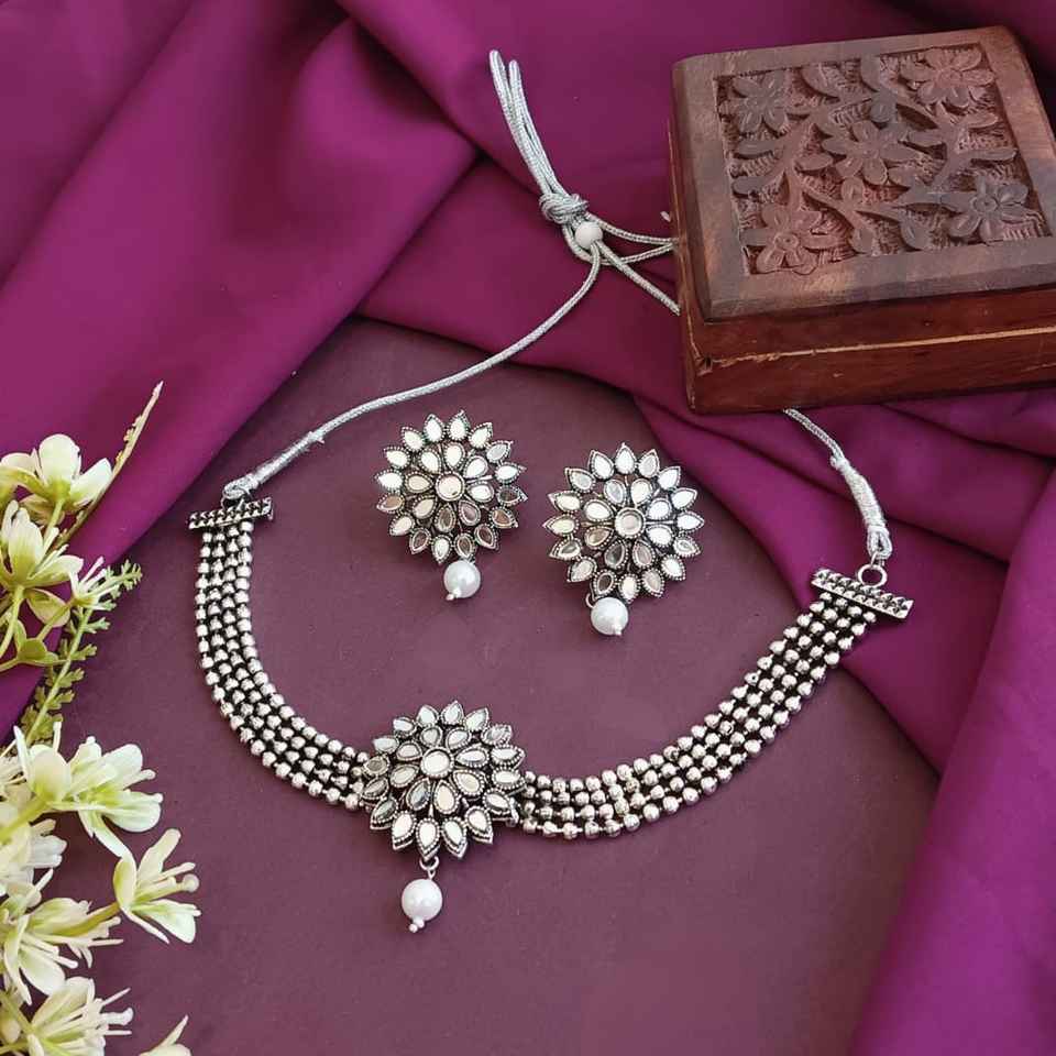 Design:Oxidized antique silver tone choker necklace earrings jewelry set